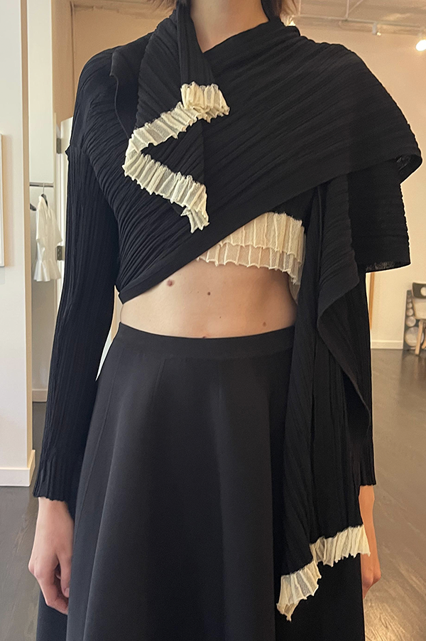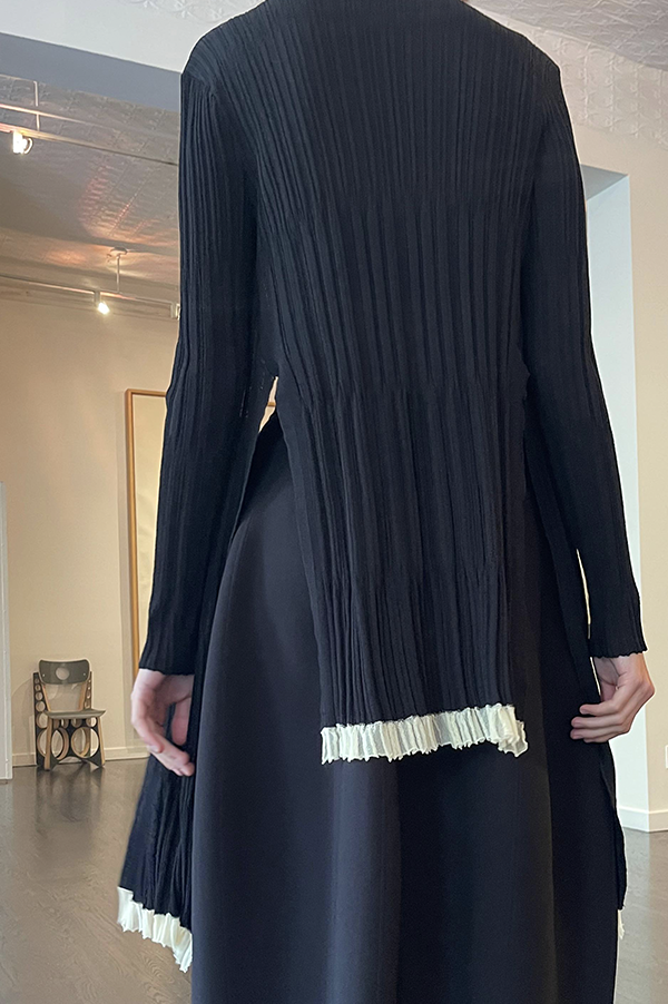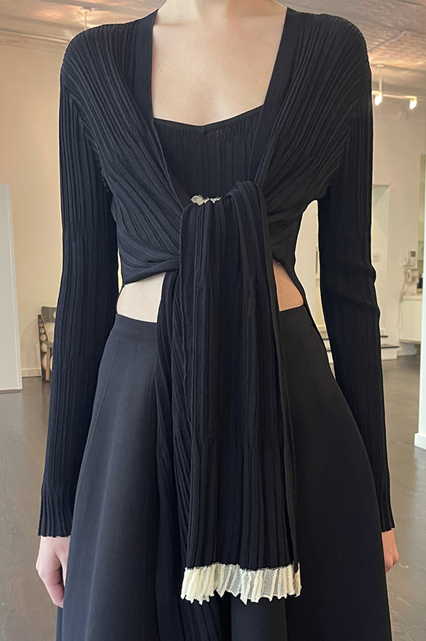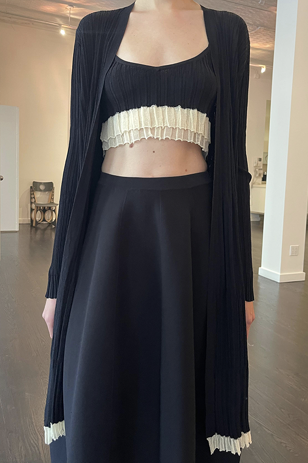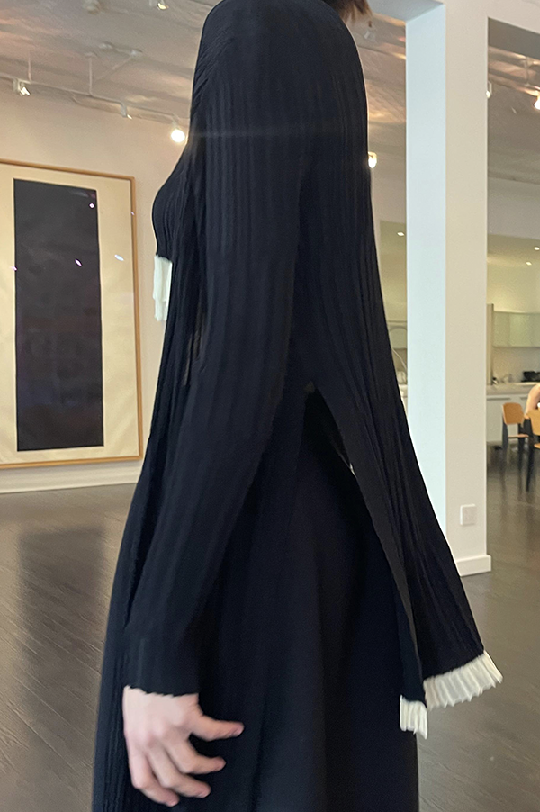 Crafted from a smooth viscose-nylon knit, the Ashlyn Mine Knit Cardigan features a streamlined silhouette and ivory contrast hem against a black base. The accordion knit, with elegant long sleeves is designed to be styled in a myriad of looks.