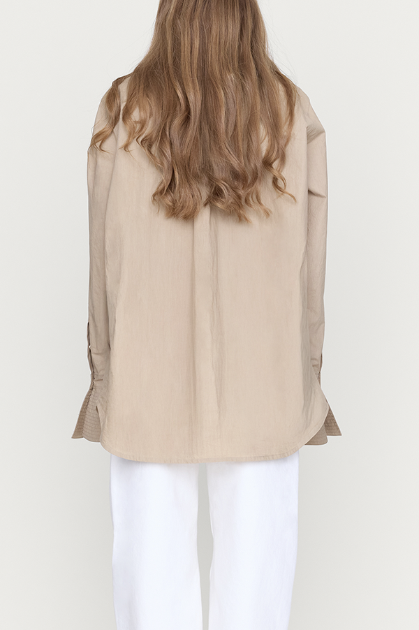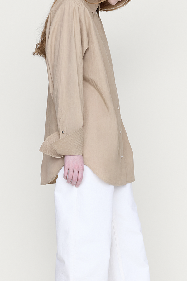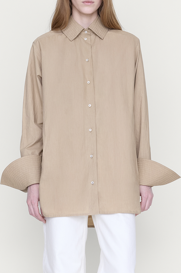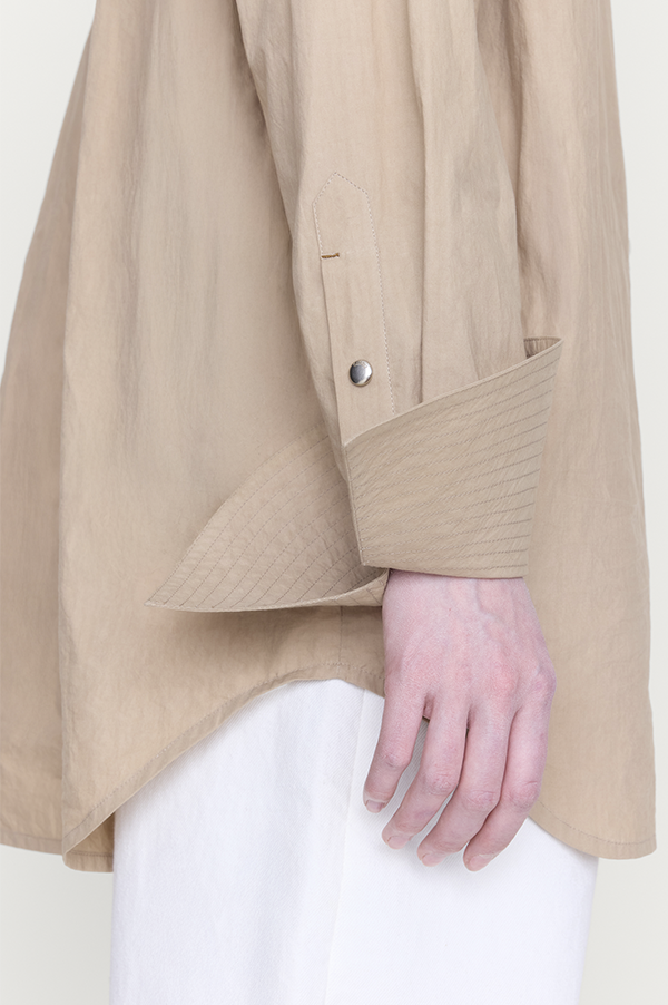 A relaxed fit button down shirt with trapunto stitch detailing at the collar and cuff. Cut from crisp cotton poplin with custom nickel snaps at each cuff.