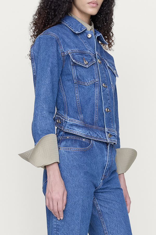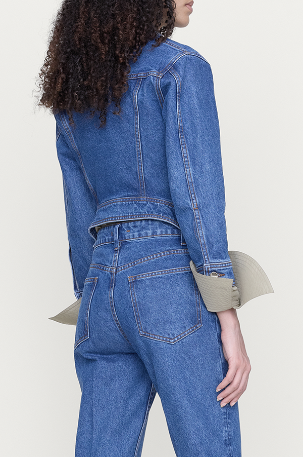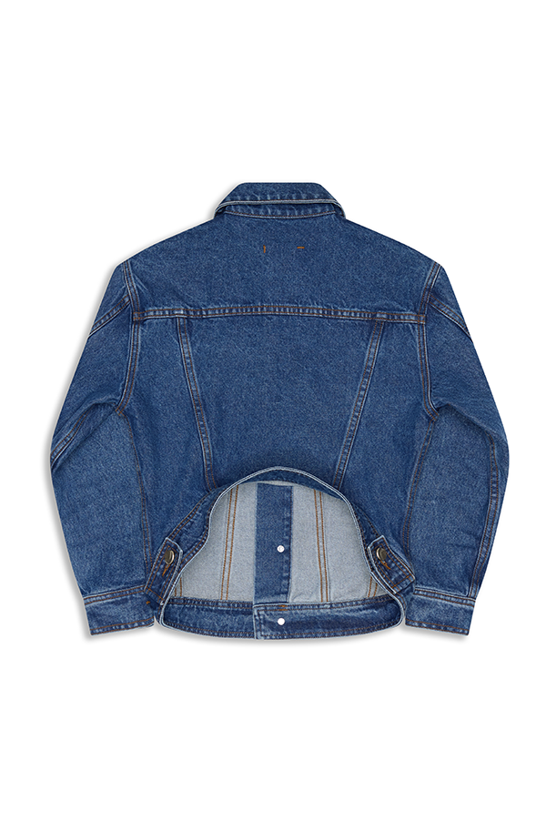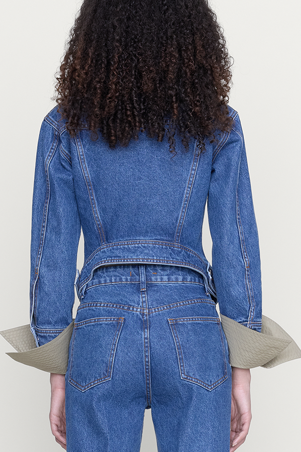 A shrunken denim jacket with a sculptural kick-back hem that warps the classic silhouette - sharp, compact, and unexpected. Designed to break in gently, softening with every wear. Made in Los Angeles.