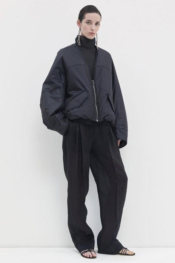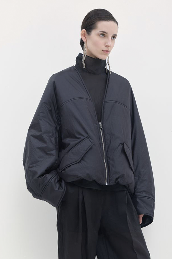 Oversized, long-sleeved puffy v-neck bomber jacket with front welt pock-ets with flaps, adjustable elastic at the hem for snugger fit, and zip front closure.