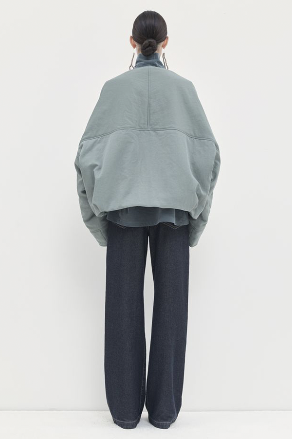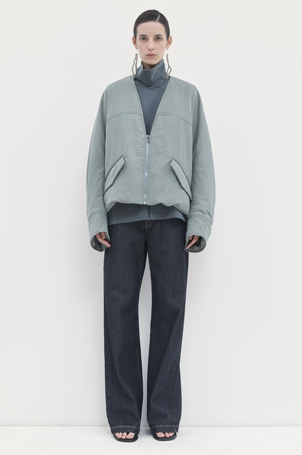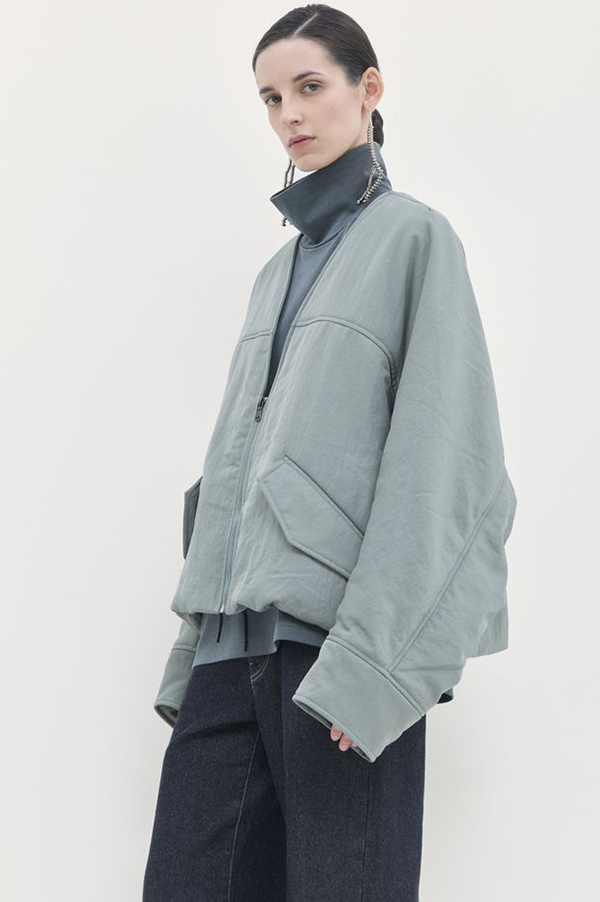 Oversized, long-sleeved puffy v-neck bomber jacket with front welt pock-ets with flaps, adjustable elastic at the hem for snugger fit, and zip front closure.