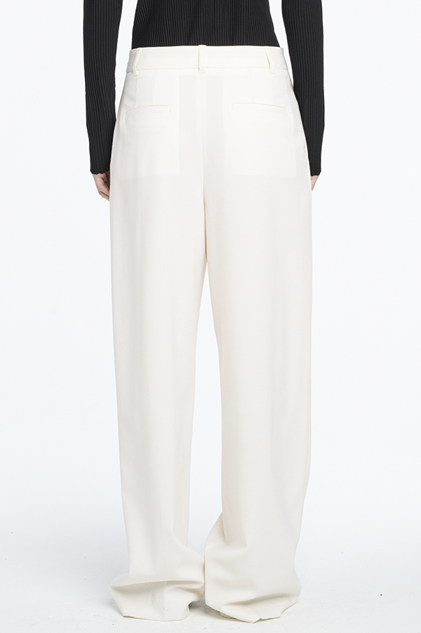 A classic trouser in an ivory lightweight wool basketweave fabrication. Fits mid-rise with a wide leg detailed with a single pleat.