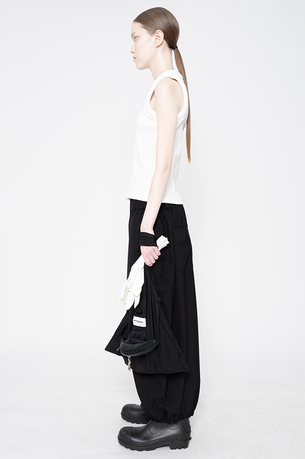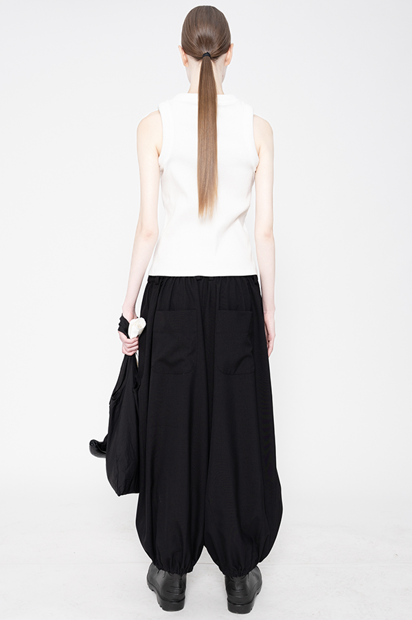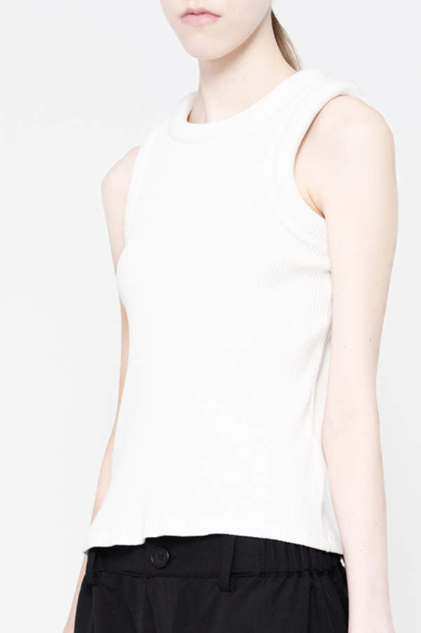 Cotton blend wide rib sleeveless fitted tank with thick edges around the arms and neckline.